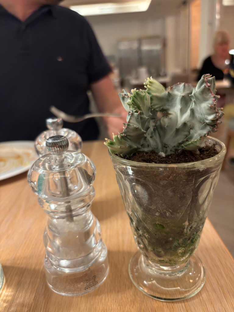 Wir sitzen beim Abendessen. Mein Mann findet, dass dieser Kaktus wie ein Salatblatt aussieht.