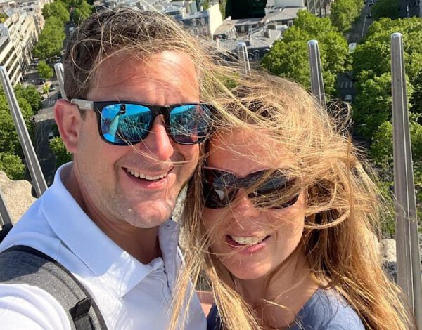 Eine Frau und ein Mann stehen vor der Kulisse von Paris. Im Hintergrund ist der Eiffelturm zu sehen. Ein starker Wind zerzaust das Haar der Frau.